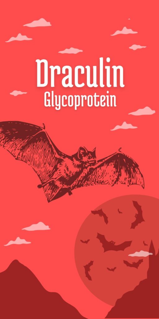Draculin Glycoprotein adalah protein yang ditemukan dalam air liur kelelawar vampir. Nama ‘Draculin’ berasal dari kata ‘Dracula’, yang merujuk pada karakter vampir terkenal dalam literatur. Gambar di atas menampilkan kelelawar terbang dengan latar belakang bulan purnama, menciptakan suasana misterius dan menakjubkan.