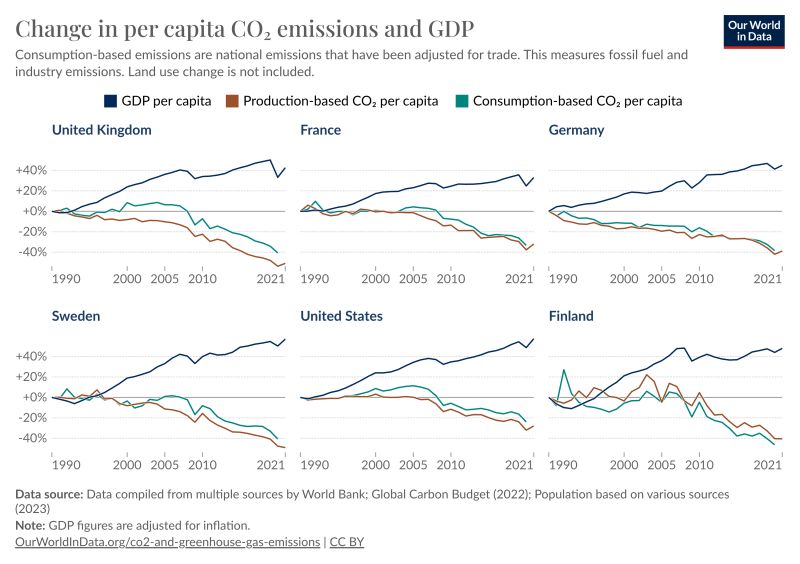 Setiap grafik menunjukkan tiga garis yang mewakili GDP per kapita (hijau), emisi CO2 berbasis produksi per kapita (biru), dan emisi CO2 berbasis konsumsi per kapita (oranye). Emisi berbasis konsumsi adalah emisi nasional yang telah disesuaikan untuk perdagangan. Ini mengukur emisi bahan bakar fosil dan industri. Perubahan penggunaan lahan tidak termasuk.