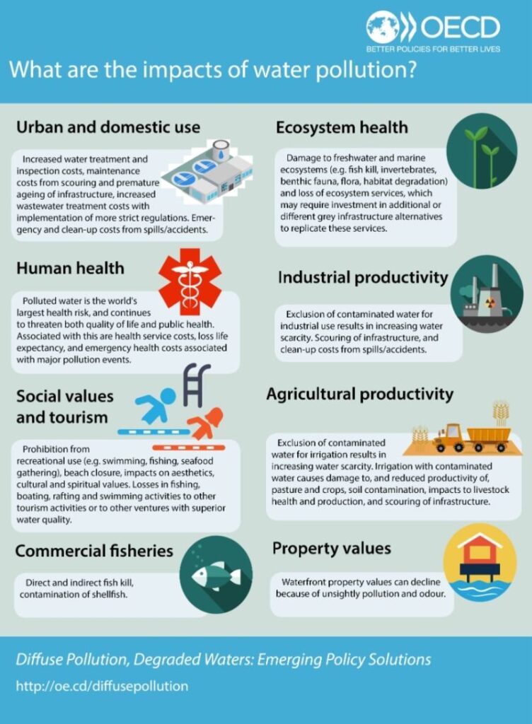 Pencemaran air telah menjadi masalah global yang serius. Dampaknya sangat terasa dalam berbagai aspek kehidupan dan lingkungan. Gambar yang Anda berikan merangkum dampak pencemaran air dengan baik. Mari kita bahas lebih lanjut.