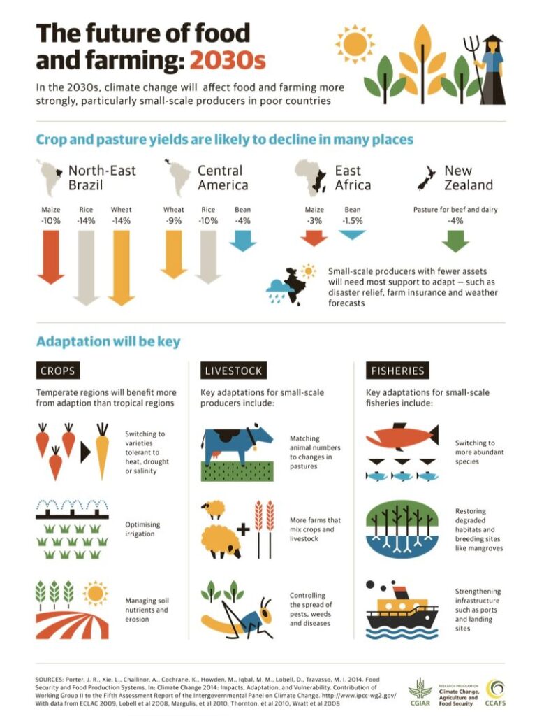 Pada tahun 2030, perubahan iklim akan memberikan dampak yang signifikan pada produksi makanan dan pertanian, terutama bagi produsen skala kecil di negara berkembang. Data menunjukkan bahwa hasil tanaman dan padang rumput kemungkinan akan menurun di banyak tempat.