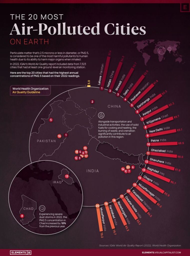 Kota-kota di seluruh dunia menghadapi tantangan polusi udara yang semakin meningkat. Data kualitatif dan kuantitatif dari gambar ini menunjukkan 20 kota dengan tingkat polusi udara terburuk di dunia, berdasarkan pengukuran PM2.5, partikel kecil yang dapat menembus paru-paru dan masuk ke aliran darah.