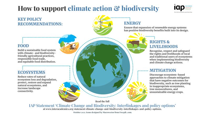 Dalam upaya mendukung aksi iklim dan keanekaragaman hayati, ada beberapa rekomendasi kebijakan kunci yang perlu diperhatikan. Pertama, membangun sistem pangan yang berkelanjutan dengan praktik pertanian yang ramah iklim dan keanekaragaman hayati. Kedua, memastikan ekspansi sistem energi terbarukan memiliki dampak positif pada keanekaragaman hayati dalam desainnya.