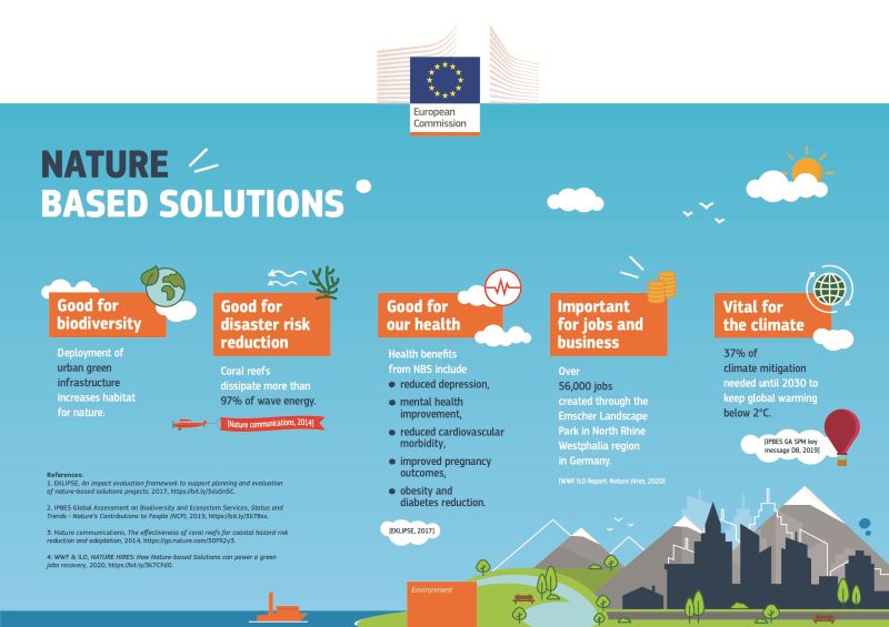 Solusi berbasis alam (Nature Based Solutions/NBS) menawarkan berbagai manfaat yang signifikan dalam berbagai aspek kehidupan dan lingkungan. Infografis dari Komisi Eropa ini menggambarkan lima manfaat utama dari NBS.