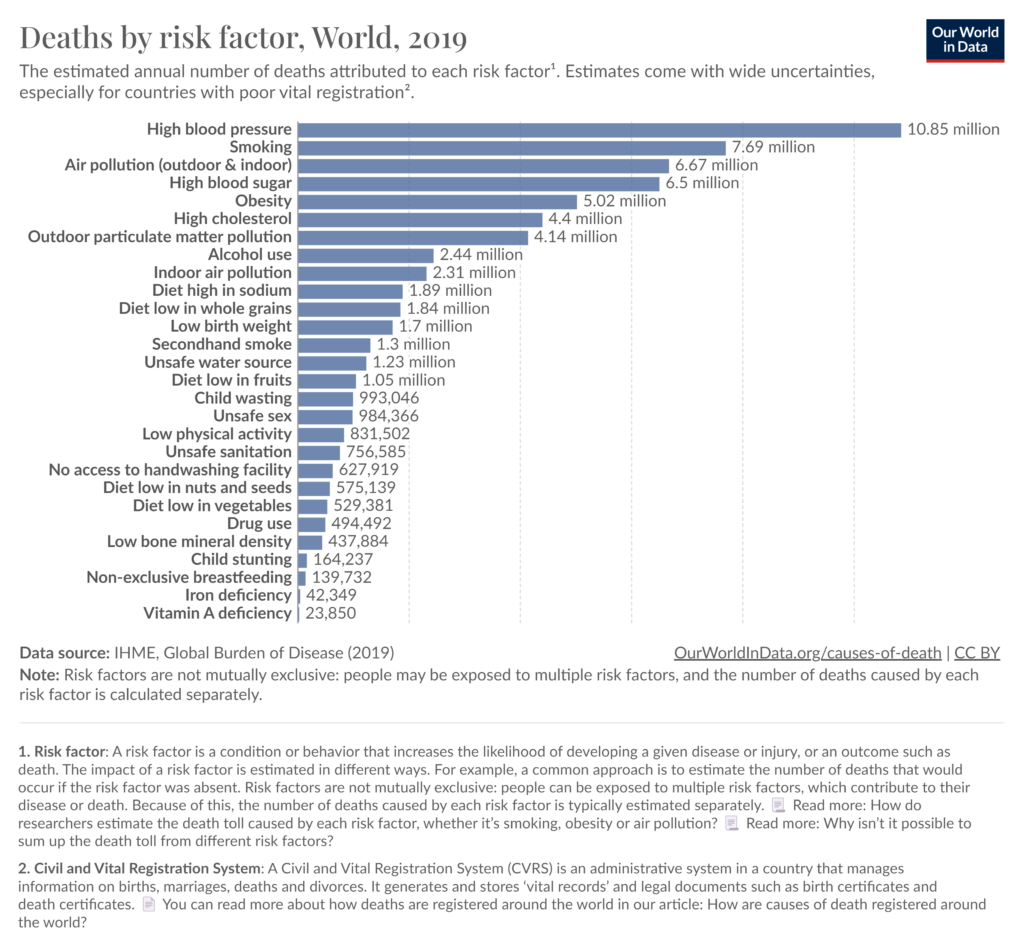 Data ini disajikan oleh Our World in Data yang mengutip sumber dari IHME, Global Burden of Disease (2019). Meskipun ada ketidakpastian dalam estimasi ini, namun memberikan gambaran umum tentang dampak signifikan faktor risiko terhadap angka kematian global.