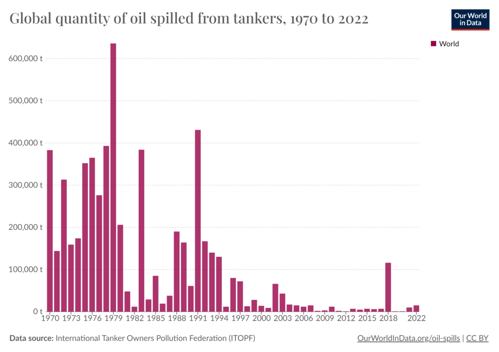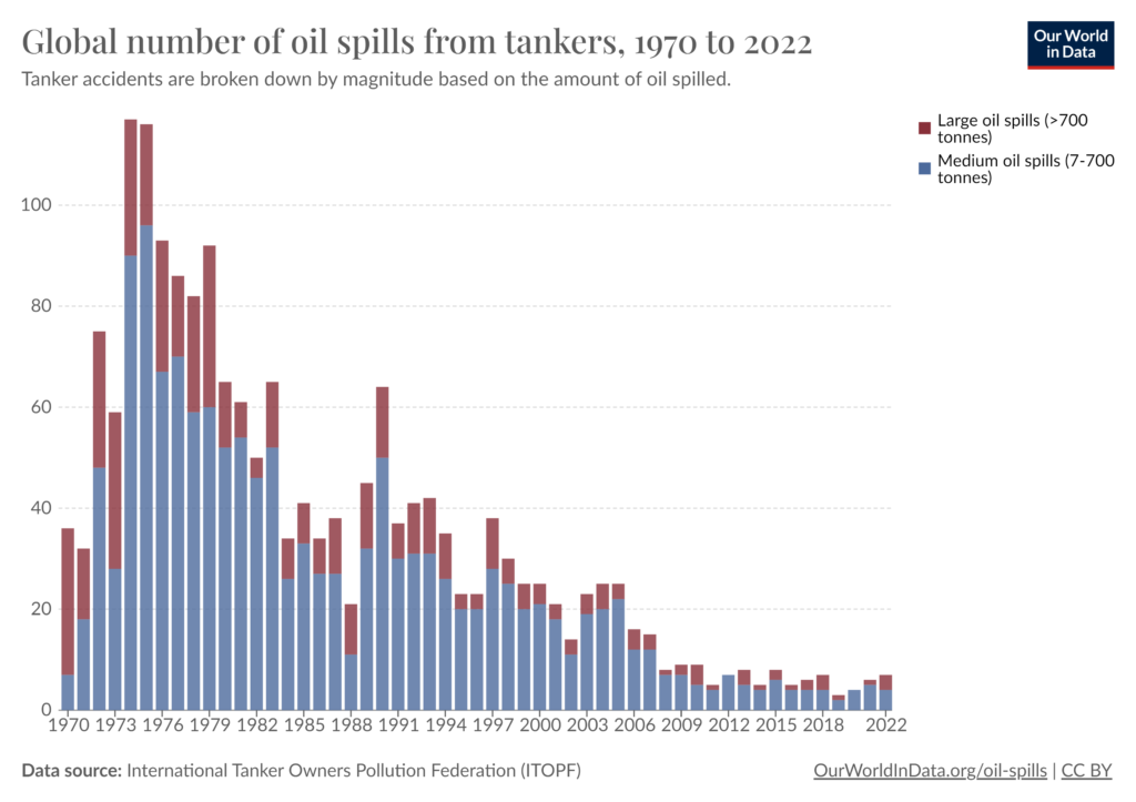 Data kuantitatif menunjukkan bahwa insiden tumpahan minyak besar (>700 ton) dan sedang (7-700 ton) telah berkurang drastis sejak puncaknya pada awal 1970-an. Pada tahun 2022, jumlah total insiden kurang dari 20 kasus.