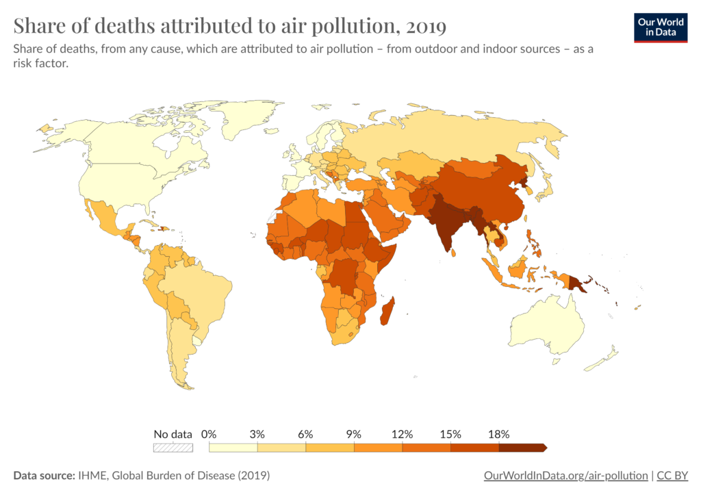 Pada tahun 2019, polusi udara menjadi penyebab kematian yang signifikan di seluruh dunia. Gambaran ini ditunjukkan oleh peta dunia yang menampilkan persentase kematian akibat polusi udara. Negara-negara dengan warna lebih gelap menunjukkan persentase kematian yang lebih tinggi akibat polusi udara. Sebagai contoh, negara-negara di Afrika dan Asia Selatan memiliki tingkat kematian tertinggi karena polusi udara.